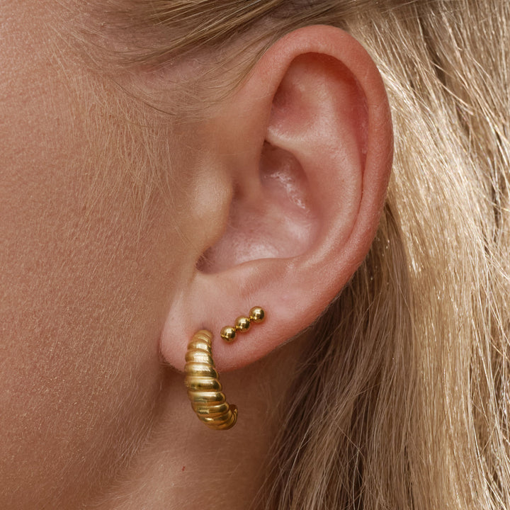 The perfect small earrings that are perfect to stack. The best part is that they are made of stainless steel, and plated with 18k real gold. In other words, they are water-resistant and won’t tarnish.