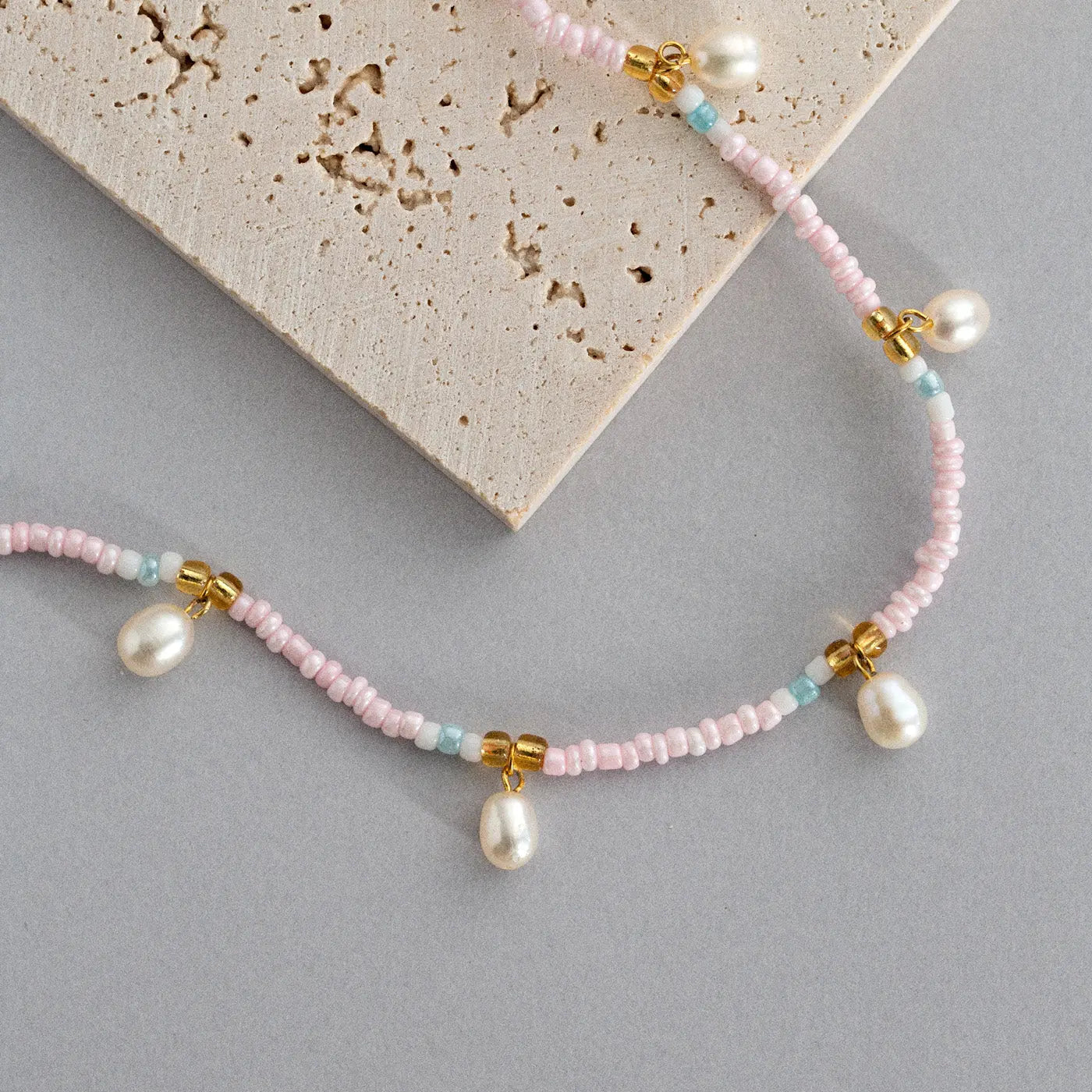 Diese handgefertigte Halskette ist das ultimative Stück für den Sommer. Tragen Sie ein einzigartiges Stück, das mit Liebe gemacht ist. Die Halskette hat fünf Meerwasserperlen und ist perfekt zum Kombinieren.